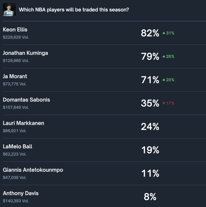 据数据网站Poly Market显示,目前浓眉在交易截止日前被交易概率只剩下8%,甚至不如此前公开向雄鹿表忠心的字母哥的11%。要知道,浓眉此前被交易概率一度高达60%,是全联盟被交易可能性最大的球员。