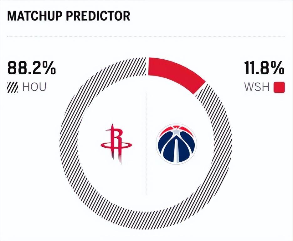 赛前,美媒ESPN对本场比赛进行了胜率预测,火箭队胜率高达88.2% ,奇才胜率则仅有可怜的11.8% ,差距非常明显。