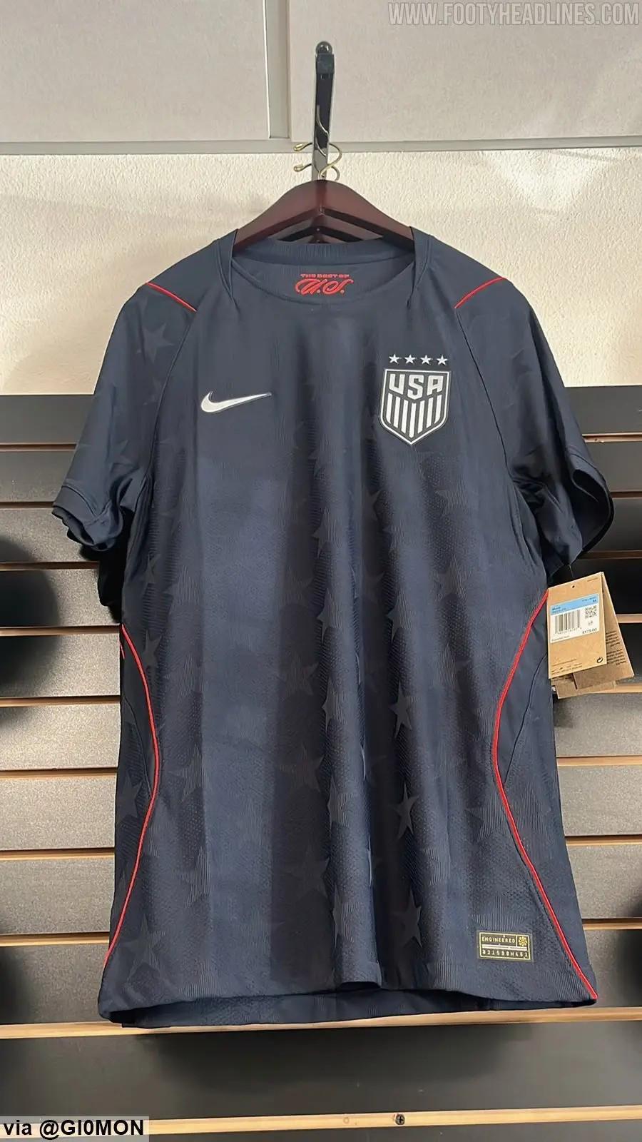 美国队的客场球衣则以深蓝色为底色,辅以五角星暗纹,这也体现了明显的美国国旗元素。