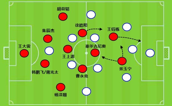 伊万先发摆出一个4312的阵型,张玉宁作为支点、王钰栋加速前插,在他们背后,是国足当前传球最好的塞尔吉尼奥、曹永竞、徐皓阳和王上源,但实战中的进攻发起依旧艰难。